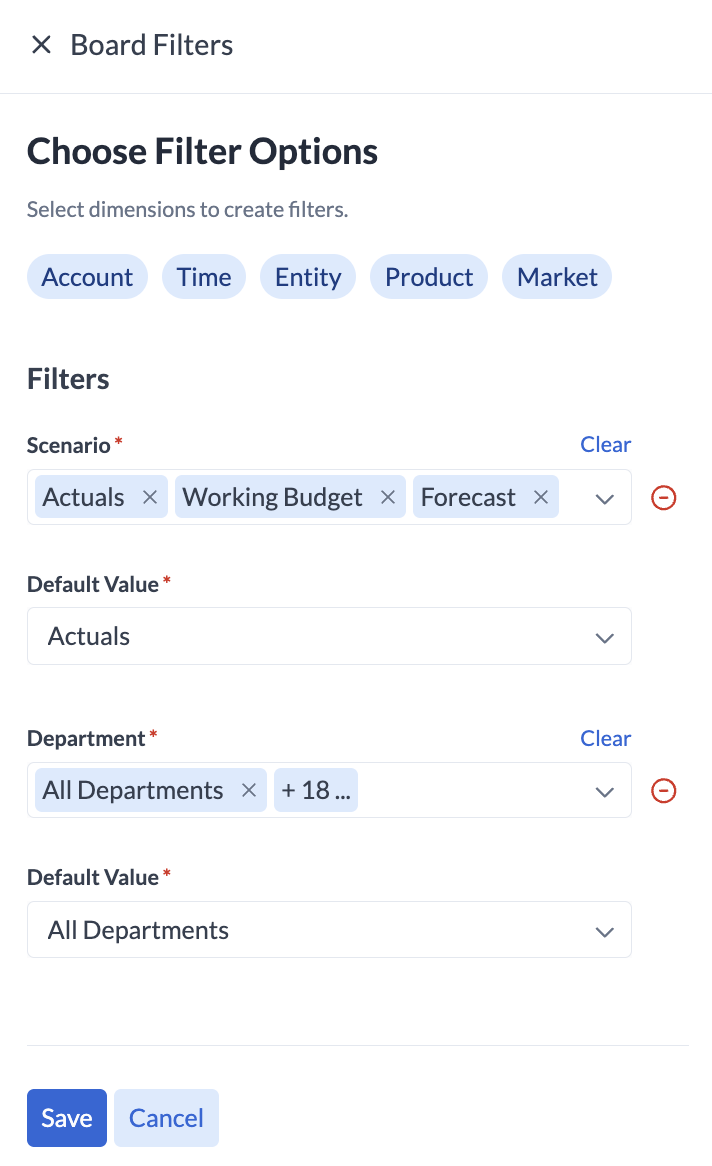 You can add board-level filters that apply to every widget on the board. Filters are configured in Edit Mode and are based on your Cube dimensions: Account, Department, Time, Entity, Product, Market, and Scenario.