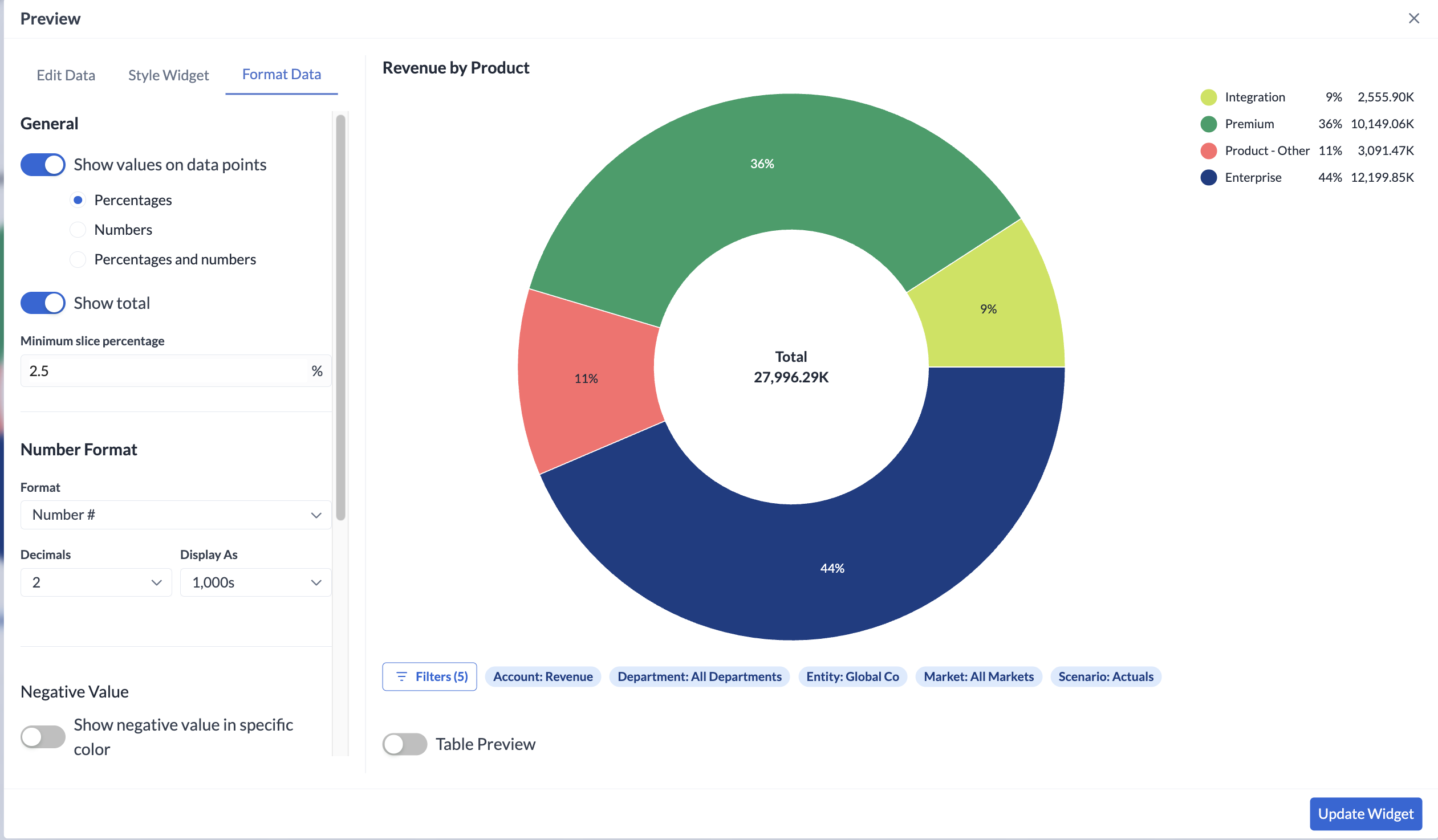 - Customize chart styling, number formatting, colors, and labels per widget