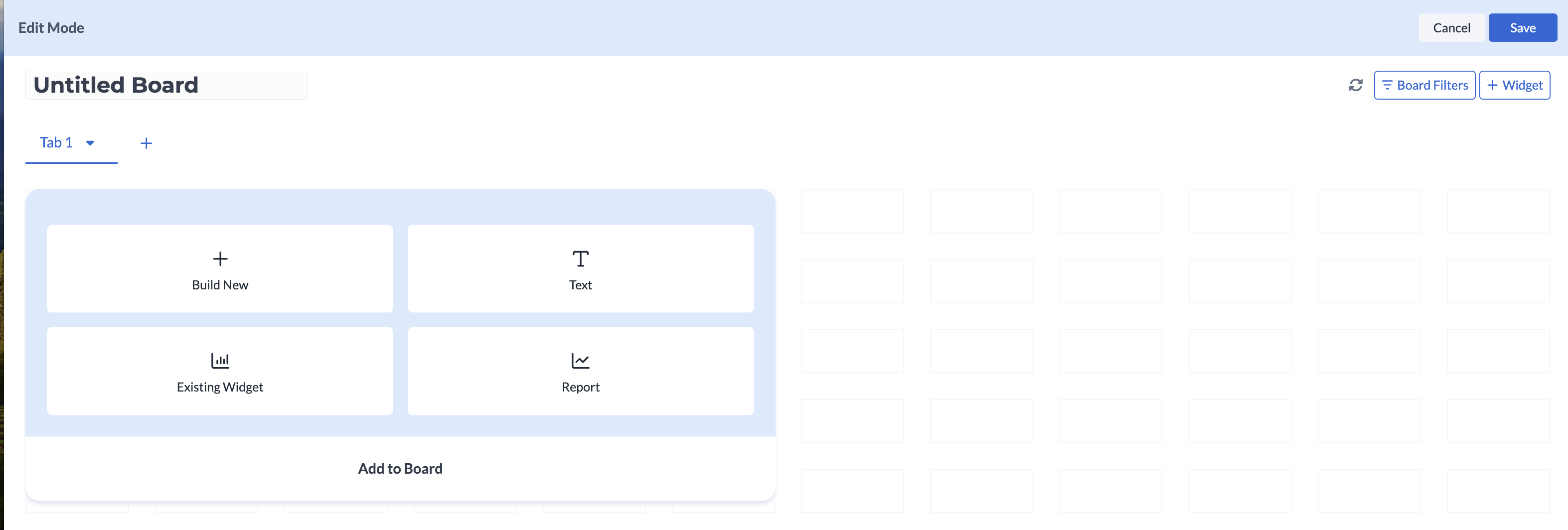 - Add widgets using the widget picker. You can build a new widget from scratch, add a text block, or insert an existing widget from another board.