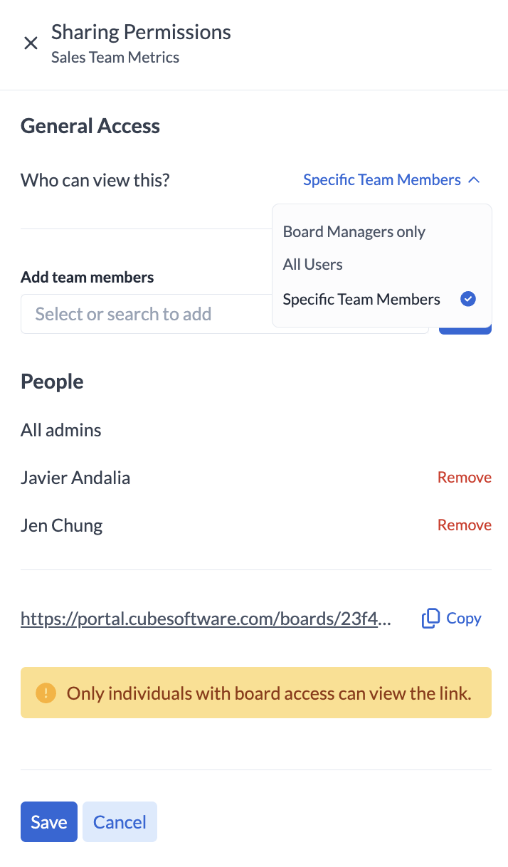 - Specific Team Members: Choose individual users or teams who can access the board.