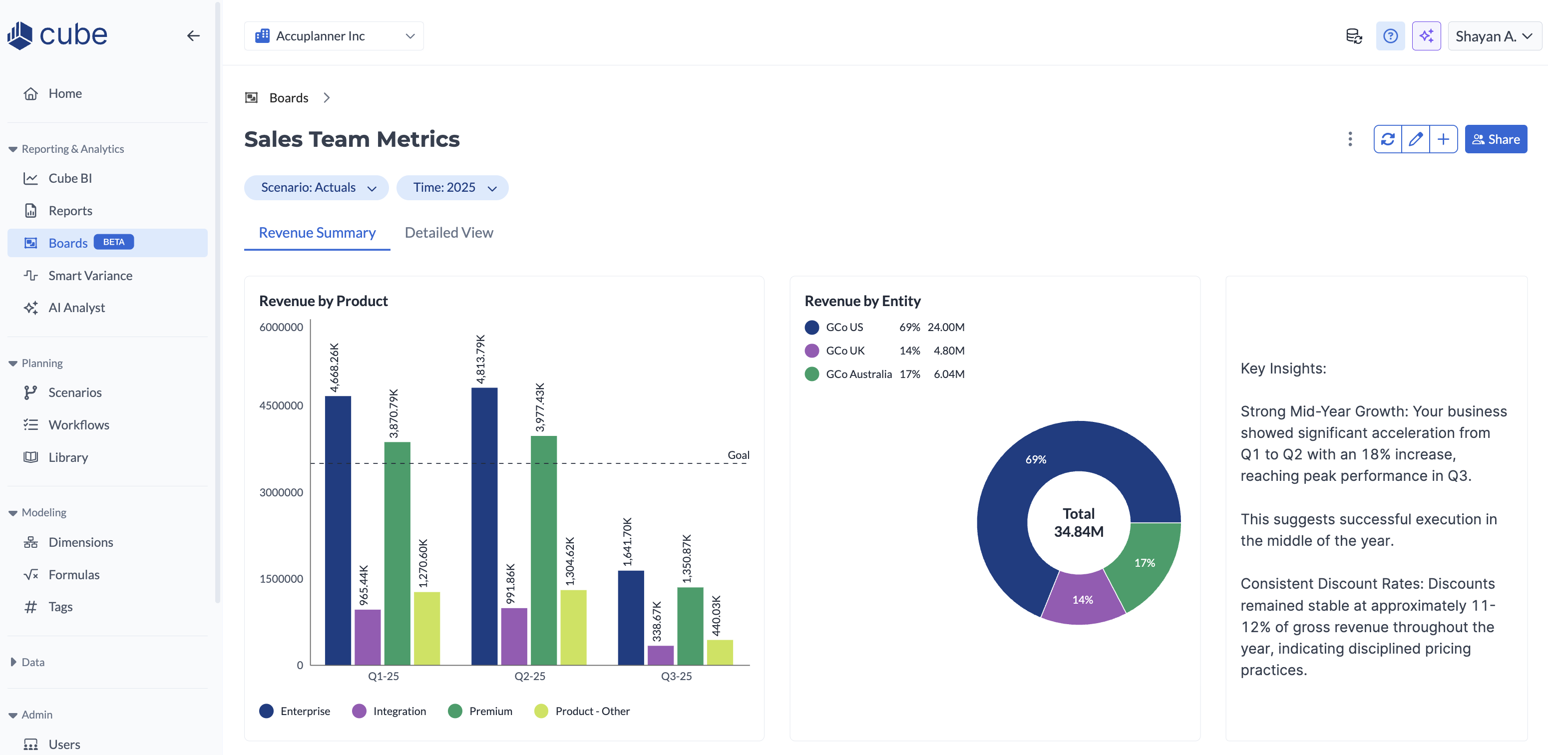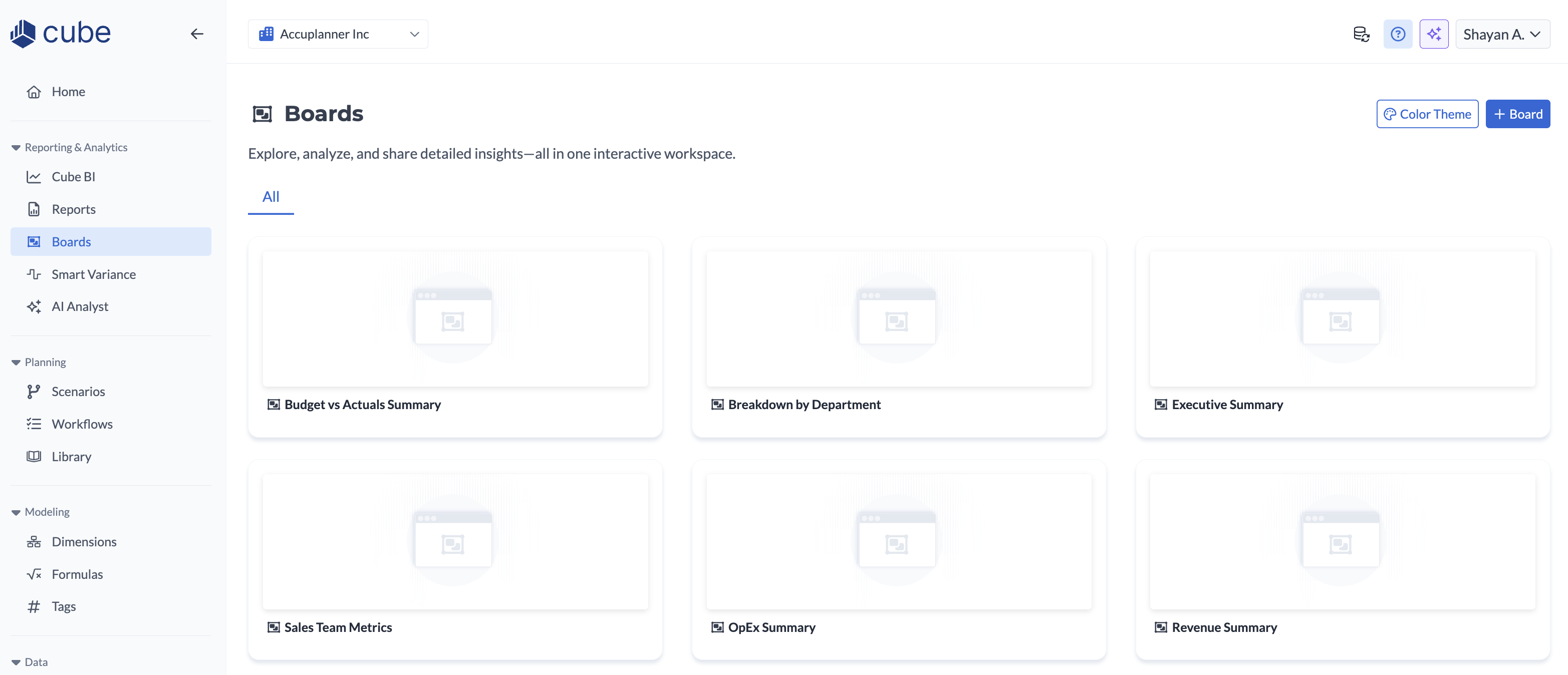 Cube Boards is a built-in dashboarding and visual reporting experience within the Cube web platform. It lets you build interactive dashboards using the same dimensions, hierarchies, and data you already use in Cube.