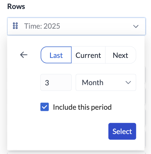 - Choose Last, Current, or Next, set the count and period type, and toggle "Include this period" as needed.