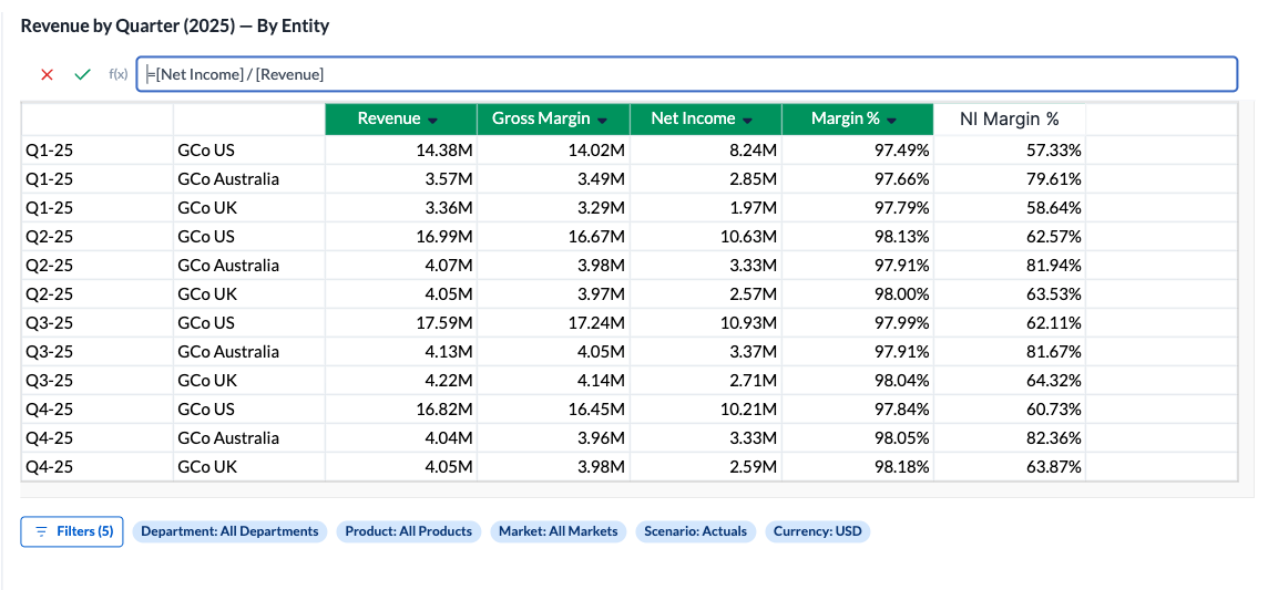 | Variance % | =([Actuals] - [Budget]) / [Budget] |